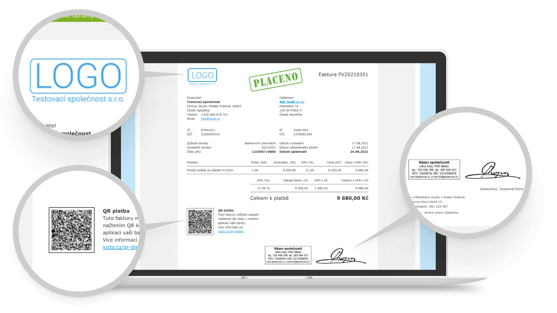 Součástí každé vaší faktury je kód QR platby pro rychlé zaplacení a formát ISDOC pro strojové zpracování na straně příjemce. Můžete si také přidat logo vaší firmy, razítko firmy a podpis.