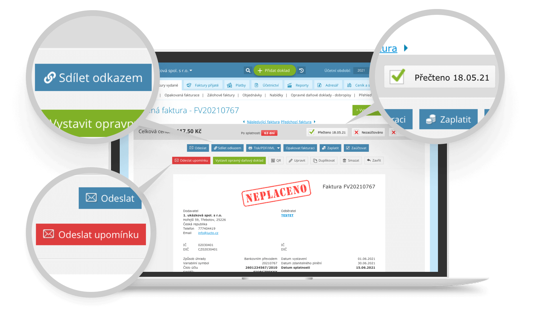 Pokud vašemu zákazníkovi odešlete fakturu k proplacení přímo z aplikace iÚčto, máte kontrolu nad tím, že si ji otevřel. Součástí každé faktury je kód pro QR platbu, díky němuž může být platba provedena rychle a jednoduše. V aplikaci iÚčto si také u každé faktury můžete nastavit, kdy se mají odeslat upomínky.